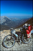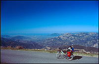 Ehrlichgesagt ist die Straße eher im Moment schwer befahrbar jedenfalls für mich. Über sechs Kilometer windet sich die Straße in zahlreichen Serpentinen mit stetigen 10% gen Himmel. Schnell klackt das Schaltwerk im ersten Gang und die Pausen werden immer häufiger. Doch der Blick wird von Kurve zu Kurve, von Höhenmeter zu Höhenmeter, immer grandioser. 15 Kilometer Luftlinie weiter ist bereits Arbatax, welches vor allem wegen seiner roten Felsen bei Touristen berühmt geworden ist. Und Arbatax liegt an der Küste. Endlich kann man seine Höhe einmal richtig sehen. Ich sehe den Meeresspiegel, über dem ich mich schließlich 1070 Meter befinde, als ich am Pass Bucca e Tomanu ankomme. Die Anstrengung hat sich gelohnt! Der Blick ist bezaubernd. Unter mir liegen die Häuser winzig klein; auch Menschen und Straßen sind kaum auszumachen. Selbst die Berge zur Küste hin liegen weit unter mir. Ich habe fast das Gefühl im Flugzeug zu sitzen.