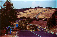 Anschließend erreichen wir Pienza, welches ebenfalls italienisches Flair pur versprüht jedoch auch von einigen Touristenbussen belagert wird. Verlässt man allerdings die „Hauptstraße“, kann man in den kleinen Gassen fast alleine vom italienischen Leben träumen. Nach einer Frühstückspause, bei der wir zwei Münchener Radler kennen lernen, begeben wir uns in brütender Hitze nach San Quirico. Am heißesten Tag der Tour quälen wir uns auf der Straße hoch und runter. Wie schon am Vortag folgt auf jeden Anstieg eine kurze Abfahrt und anschließend ein (subjektiv) noch längerer Anstieg. Diese Landschaft, welche auf dem Höhenprofil aussieht wie ein Sägeblatt, zehrt stark von Nerven und Kondition. Beim nächsten starken Anstieg streikt dann auch Christians Knie völlig unter der starken Belastung. Nichts geht mehr. Wir machen eine längere Pause und um Christians Knie zu schonen, geht es abwechselnd schiebend oder kurze Zeit fahrend immer weiter nach oben. Verantwortlich für den starken Anstieg sind die Ausläufer des Monte Amiata, eines erloschenen Vulkans, welcher Nord- und Südtoskana voneinander trennt.